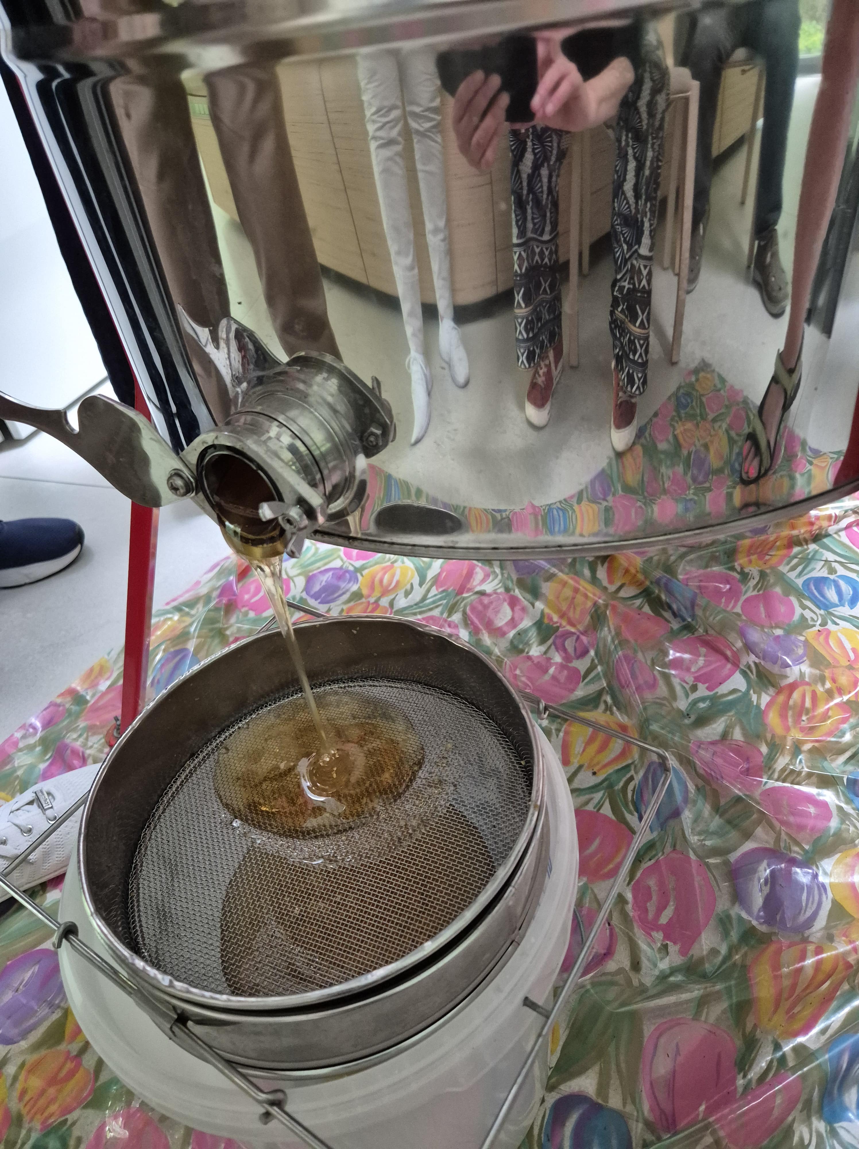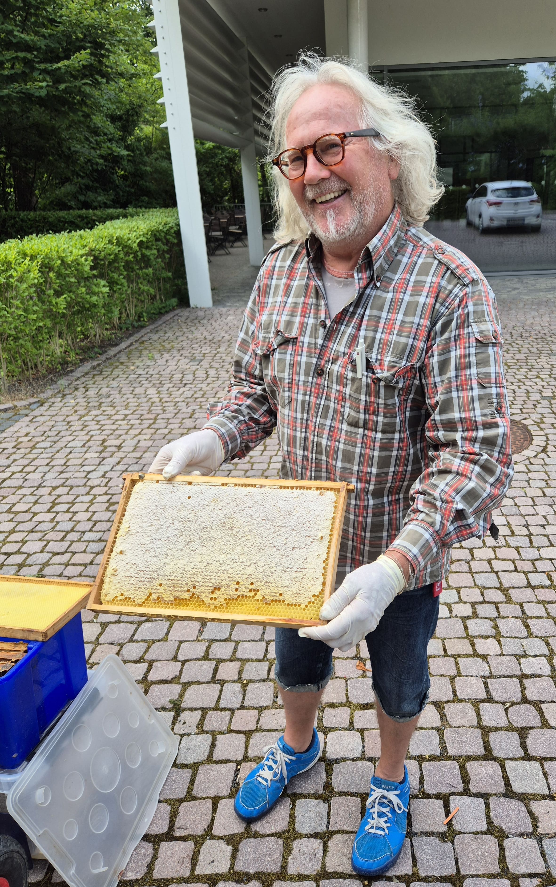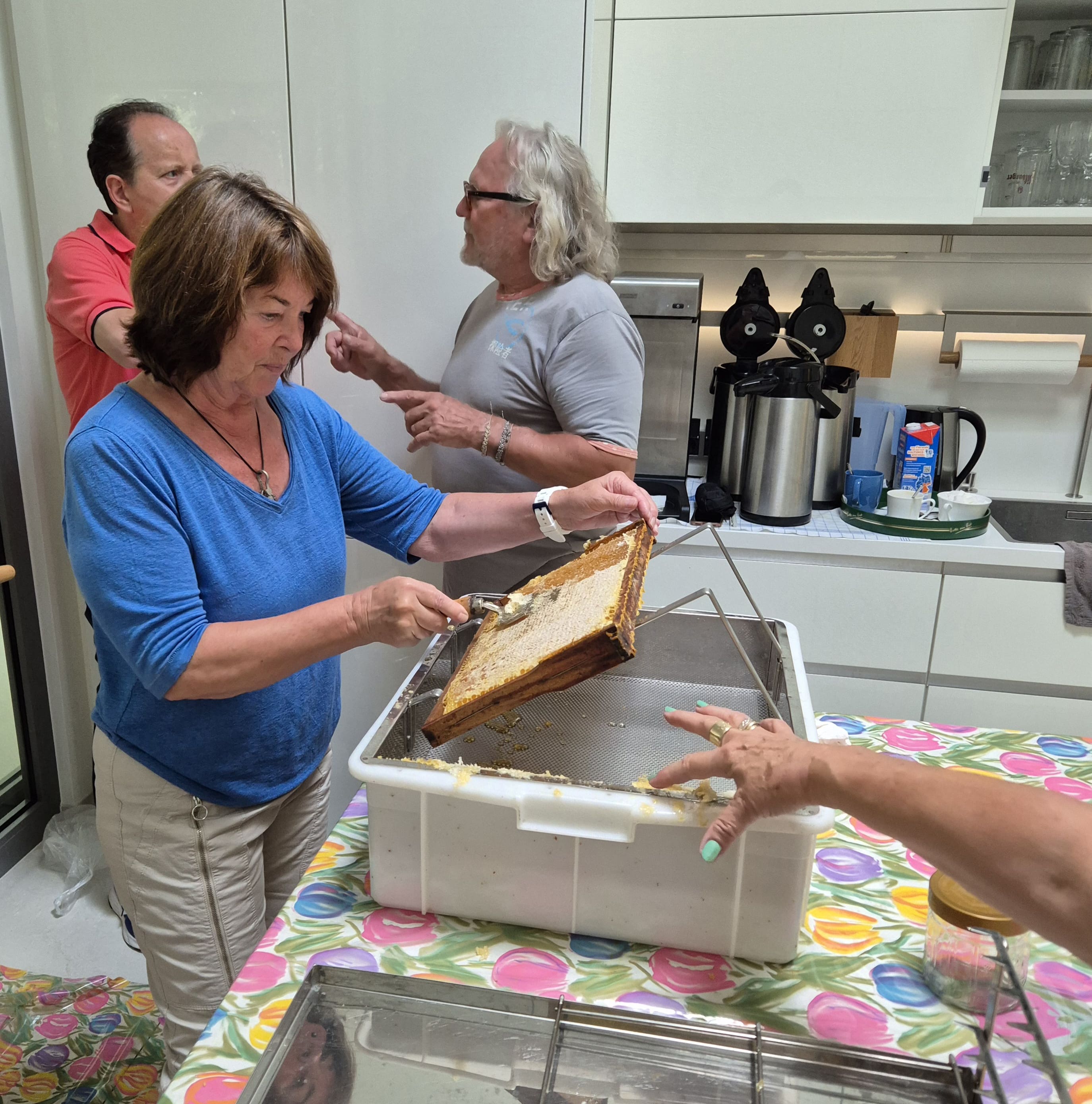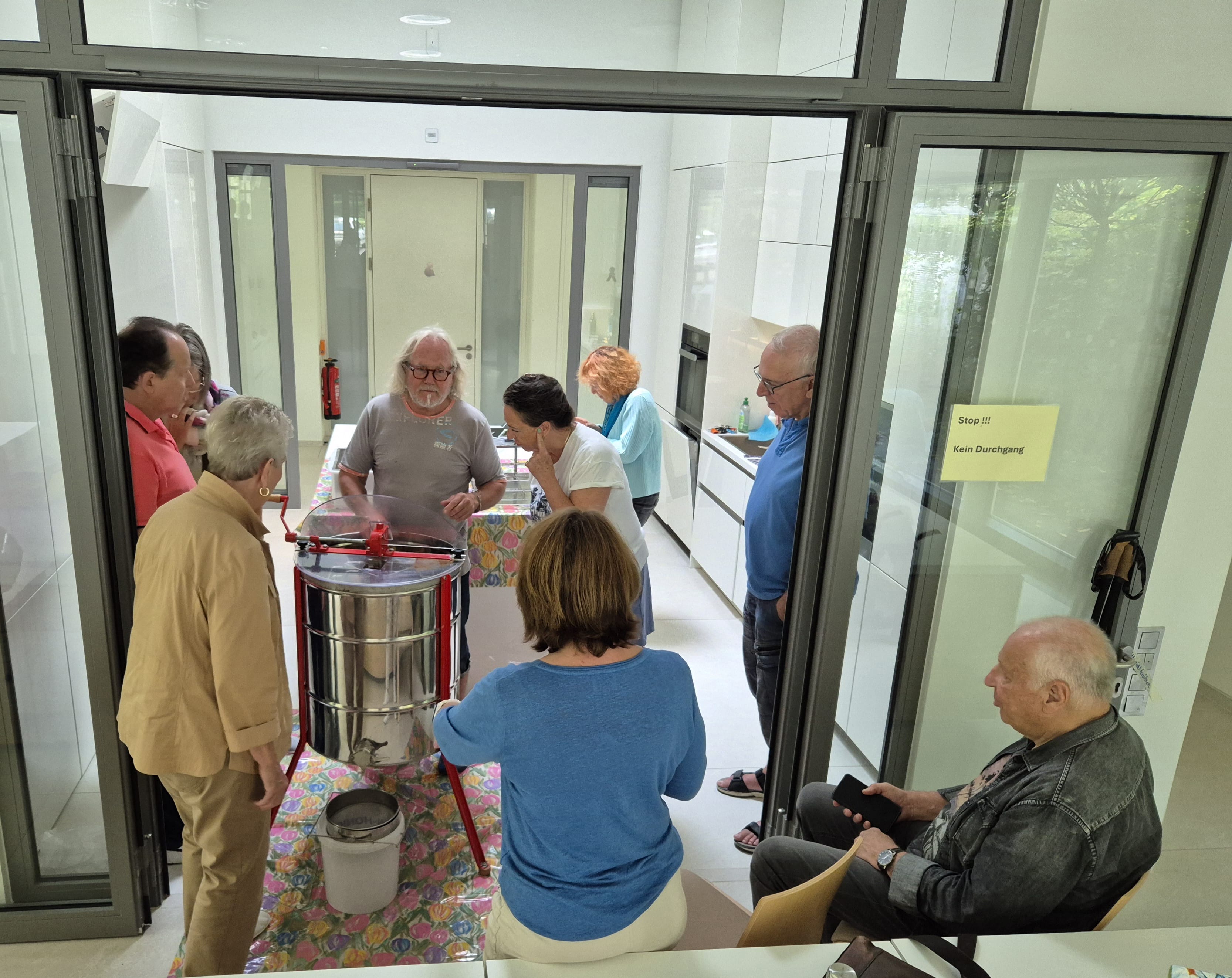 Das hätte Georg Brentanos Herz erfreut als am 16. Juli der erste Honigder jungen Bienenvölker geschleudert wurde. Unser Imker, Peter Kühnel aus Oestrich Winkel, beglückte uns bereits mit einem Bienenstock im Fenster des Petrihauses und zwei weiteren Stöcken an der Mauer hinter einer Hecke im Gartengelände sowie mit einem Einführungsvortrag zum Verständnis der Bienen und der Imkerei. Inzwischen sind aus den ursprünglich zwei Völkchen ohne Königin vier Völker mit Königinnen geworden. Was für eine Freude! Nun war es soweit. Den hochinteressierten Gästen gab Herr Kühnel Einblick in seine Arbeit, erzählte von der wunderbaren Insektengattung, die es seit 120 Millionen Jahren gibt, und beantwortete unzählige Fragen. So erfuhren wir viel über Blüten, Nektar, Pollen, Wachs und Waben. Besonders erlebnisreich war seine Einladung zur Mitwirkung bei all seinen Handgriffen bis hin zum Entdeckeln der Bienenwaben und schließlich, als Höhepunkt, zum Schleudern mit dem dazu mitgebrachten Gerät. Nicht zuletzt das Naschen des köstlichen Produkts ließ sich niemand entgehen. Wir freuen uns, wenn am Tag des offenen Denkmals, dem 14.September, neben vielfältigen Programmpunkten der erste Brentano-Honig gekostet werden kann und verkauft wird.