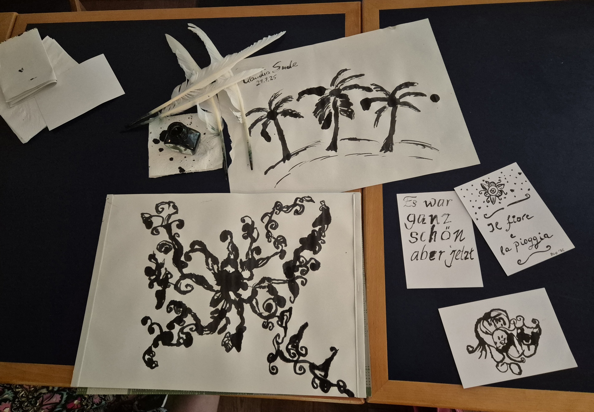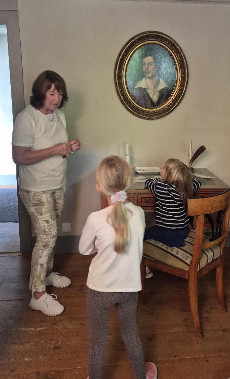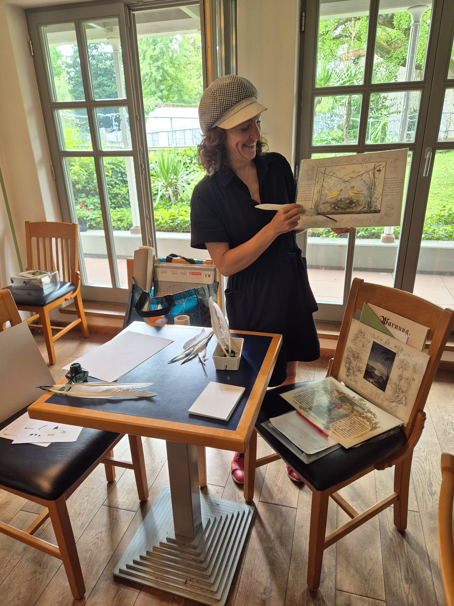 Am 27. Juli, dem letzten Sonntag des Monats, gab es ein ganz besonders umfassendes Veranstaltungsangebot. Neben der Einladung zum Besuch des Museums und anschließendem Zusammensein bei Kaffee und Kuchen sowie dem lyrisch-botanischen Stelldichein mit Goethes Muse Marianne von Willemer, gespielt von Katharina Schaaf, durften wieder einmal Kinder und deren Begleitungen unter der Führung von Rose-Maria Behboudi das Petrihaus erkunden und entdecken. Darüber hinaus leitete unsere Museums-und Erlebnispädagogin Annina Schubert einen offenen Workshop als Gelegenheit für Klein und Groß, sich mit einer Schreibfeder, dem Gänsekiel, auszuprobieren. Alle Teilnehmerinnen und Teilnehmer waren überaus interessiert aus verschiedenen Gründen. Die Kinder hatten kurz vorher neben Möbeln und Bienenstock im Fenster auch Georg Brentanos Schreibtisch bestaunt und die Federn sogar in die Hand nehmen dürfen. Natürlich freuten sie sich darüber, dass sie selbst mit dem historischen Instrument auch zeichnen konnten, nach der Natur und der Phantasie. Mehrere Gäste der älteren Generation berichteten von ihren Schönschreib-Übungen in den Schulen ihrer Kindheit und eine Dame imponierte sogar mit vorbildlichem Sütterlin mit Gänsekiel. Begeistert und dankbar verabschiedeten sich alle und wollen unbedingt wiederkommen in das traumschöne Ambiente im und um das Petrihaus.