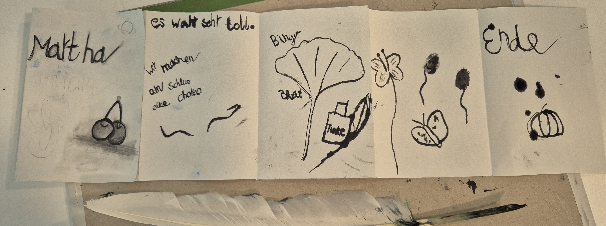 Am 27. Juli, dem letzten Sonntag des Monats, gab es ein ganz besonders umfassendes Veranstaltungsangebot. Neben der Einladung zum Besuch des Museums und anschließendem Zusammensein bei Kaffee und Kuchen sowie dem lyrisch-botanischen Stelldichein mit Goethes Muse Marianne von Willemer, gespielt von Katharina Schaaf, durften wieder einmal Kinder und deren Begleitungen unter der Führung von Rose-Maria Behboudi das Petrihaus erkunden und entdecken. Darüber hinaus leitete unsere Museums-und Erlebnispädagogin Annina Schubert einen offenen Workshop als Gelegenheit für Klein und Groß, sich mit einer Schreibfeder, dem Gänsekiel, auszuprobieren. Alle Teilnehmerinnen und Teilnehmer waren überaus interessiert aus verschiedenen Gründen. Die Kinder hatten kurz vorher neben Möbeln und Bienenstock im Fenster auch Georg Brentanos Schreibtisch bestaunt und die Federn sogar in die Hand nehmen dürfen. Natürlich freuten sie sich darüber, dass sie selbst mit dem historischen Instrument auch zeichnen konnten, nach der Natur und der Phantasie. Mehrere Gäste der älteren Generation berichteten von ihren Schönschreib-Übungen in den Schulen ihrer Kindheit und eine Dame imponierte sogar mit vorbildlichem Sütterlin mit Gänsekiel. Begeistert und dankbar verabschiedeten sich alle und wollen unbedingt wiederkommen in das traumschöne Ambiente im und um das Petrihaus.